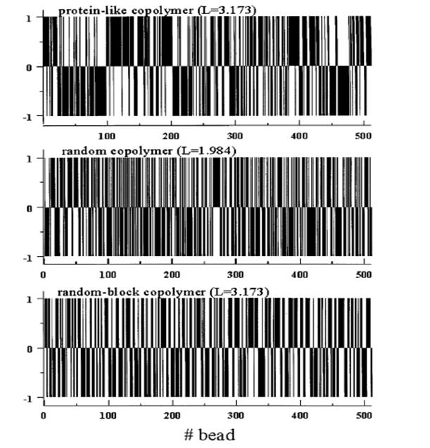 Типичное распределение Р и Н мономерных звеньев вдоль цепи белковоподобного сополимера с L = 3.173, случайного сополимера с L = 1.984 и случайно-блочного с L = 3.173. Р - звенья обазначены как –1, Н – звенья как +1. Длина цепи N = 512. [3]