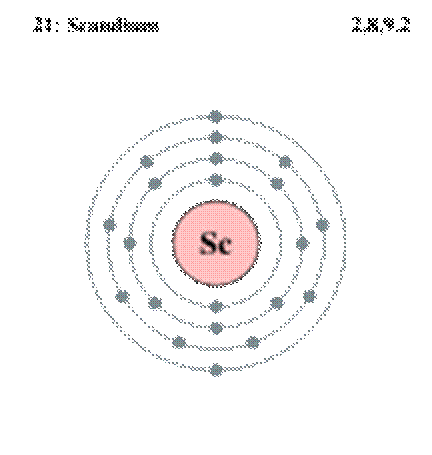 Sc - первый переходный элемент с одним 3d-электроном; конфигурация внешних электронов атома 3d1 4s2 . По химическому поведению сходен с другими переходными элементами в степени окисления +3 (например, Ti3+ , Fe3+ , Mn3+ ), элементами подгруппы Al, Be, а также элементами иттриевой подгруппы, вместе с которыми его иногда относят к редкоземельным элементам.