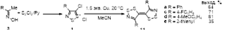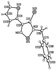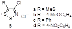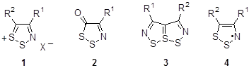 Среди пятичленных сера-азотистых гетероциклов 1,2,3-дитиазолы занимают важное место благодаря интересным физическим и биологическим свойствам, а также разнообразной химии их производных. Из соединений этого класса известны как положительно заряженные моноциклические и конденсированные 1,2,3-дитиазолы 1, так и нейтральные 1,2,3-дитиазол-5-оны и их производные 2, бициклические гетеропенталены 3. Особое место среди соединений этого класса занимают интенсивно исследуемые в последнее время стабильные конденсированные 1,2,3-дитиазолильные радикалы 4, которые предлагаются для использования в качестве проводящих и магнитных материалов.