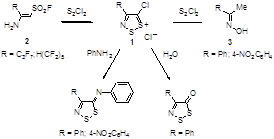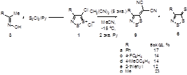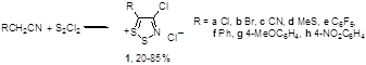 Наиболее важное и интенсивно исследующееся до настоящего времени соединение класса 1,2,3-дитиазолов – соль Аппеля 1а была впервые получена реакцией ацетонитрила с монохлоридом серы и описана как нестабильный 2,3,4-трихлор-1,2,3-дитиазол.[4] Позднее Аппель и соавторы выделили это соединение при реакции хлорацетонитрила с S2 Cl2 в хлористом метилене, и эта методика является наиболее удобным методом синтеза соединения 1а. Соль Аппеля может быть также получена при взаимодействии монохлорида серы с этиламином, но выход конечного продукта и условия реакции не раскрываются.[5] Недавно ряд монозамещенных ацетонитрилов был превращен в хлориды 5-R-4-хлор-1,2,3-дитиазолия 1 (Схема 1).[6,7]