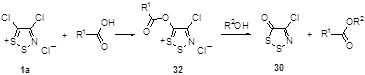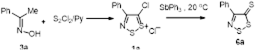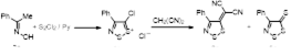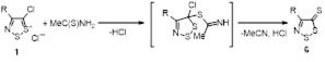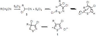 Для превращения замещенных ацетонитрилов в соли 1,2,3-дитиазолия были предложены различные механизмы, однако строгих доказательств пока не получено. Можно предположить, что первой стадией этого превращения является хлорирование ацетонитрила монохлоридом серы до α-хлорацетонитрилов 5, как это продемонстрировано для ацетонитрила [1] и для фенилацетонитрила.[8] Далее, по-видимому, может происходить присоединение S2 Cl2 к нитрильной группе, циклизация и ионизация дитиазола (Схема 2).