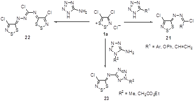 Исследованы химические свойства 4-замещенных 5Н-1,2,3-дитиазолов. Показано, что реакции 4-замещенных 5Н-1,2,3-дитиазолов с нуклеофильными реагентами, в отличие от 4-хлорзамещенных производных, могут приводить к новым гетероциклическим продуктам.