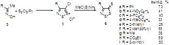 Систематически исследовано взаимодействие этаноноксимов с монохлоридом серы, разработаны новые, удобные, однореакторные методы синтеза ранее неизвестных 4-замещенных производных 5Н-1,2,3-дитиазолов: кетонов, тионов, иминов и илиденов.