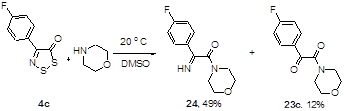 Показано, что взаимодействие 4-замещенных 5Н-1,2,3-дитиазол-5-онов и 5-тионов со вторичными аминами протекает с образованием 2-оксоацетамидов и 2-иминотиоацетамидов, соответственно.