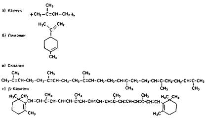 Многие другие природные соединения тоже содержат изопреновые структурные фрагменты. Например, лимонен содержит два изопреновых фрагмента. Лимонен является главной составной частью масел, извлекаемых из кожуры цитрусовых, например лимонов и апельсинов. Это соединение принадлежит к классу соединений, называемых терпенами. Терпены содержат в своих молекулах 10 атомов углерода (С10 -соединения) и включают два изопреновых фрагмента, соединенных друг с другом последовательно («голова к хвосту»). Соединения с четырьмя изопреновыми фрагментами (С20 -соединения) называются дитерпенами, а с шестью изопреновыми фрагментами -тритерпенами (С30 -соединения). Сквален, который содержится в масле из печени акулы, представляет собой тритерпен. Тетратерпены (С40 -соединения) содержат восемь изопреновых фрагментов. Тетратерпены содержатся в пигментах жиров растительного и животного происхождения. Их окраска обусловлена наличием длинной сопряженной системы двойных связей. Например, β-каротин ответствен за характерную оранжевую окраску моркови.