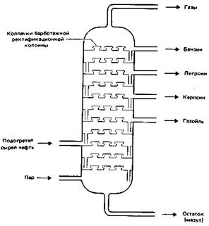 Из сырой нефти прежде всего удаляют растворенные в ней примеси газов, подвергая ее простой перегонке. Затем нефть подвергают первичной перегонке , в результате чего ее разделяют на газовую, легкую и среднюю фракции и мазут. Дальнейшая фракционная перегонка легкой и средней фракций, а также вакуумная перегонка мазута приводит к образованию большого числа фракций. В табл. 4 указаны диапазоны температур кипения и состав различных фракций нефти, а на рис. 5 изображена схема устройства первичной дистилляционной (ректификационной) колонны для перегонки нефти. Перейдем теперь к описанию свойств отдельных фракций нефти.