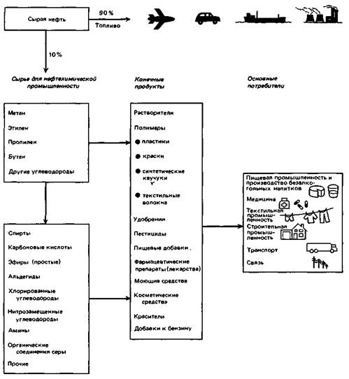 Сырая нефть представляет собой маслянистую жидкость, окраска которой может быть самой разнообразной – от темно-коричневой или зеленой до почти бесцветной. В ней содержится большое число алканов. Среди них есть неразветвленные алканы, разветвленные алканы и циклоалканы с числом атомов углерода от пяти до 40. Промышленное название этих циклоалканов-начтены. В сырой нефти, кроме того, содержится приблизительно 10% ароматических углеводородов, а также небольшое количество других соединений, содержащих серу, кислород и азот.
