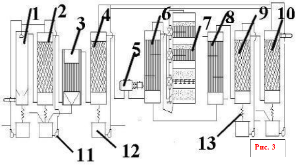 1 - 1-я промывная башня; 2 - 2-я промывная башня с насадкой; 3 - мокрый электрофильтр; 4 - сушильная башня с насадкой; 5 - турбокомпресор; 6 - трубчатый теплообменник; 7 - контактный аппарат; 8 - трубчатый холодильник газа; 9 и 10 - абсорбционные башни с насадкой; 11 - центробежные насосы; 12 - сборники кислоты; 13 - холодильники кислоты