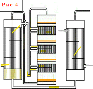 - один из наиболее распространненых типов контактных аппаратов. Принцип их действия состоит в том, что подогрев и охлаждение газа между слоями катализатора, лежащими на полках, производится в самом контактном аппарате с использованием различных теплоносителей или способов охлаждения .В аппаратах такого типа высота каждого нижележащего слоя катализатора выше, чем расположенного над ним, т.е. увеличивается по ходу газа, а высота теплообменников уменьшается, так как по мере возрастания общей степени превращения скорость реакции снижается и соответственно уменьшается количество выделившегося тепла. В межтрубном пространстве теплообменников последовательно снизу вверх проходит свежий газ, охлаждая продукты реакции и нагреваясь до тепмпературы начала реакции