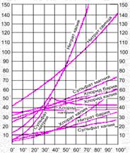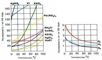 Влияние температуры . Если растворение вещества является экзотермическим процессом, то с повышением температуры его растворимость уменьшается (Например,Ca(OH)2 в воде) и наоборот. Для большинства солей характерно увеличение растворимости при нагревании.