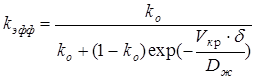 Условие полного перемешивания на практике реализовать невозможно. Процессы массопереноса в расплавленной зоне при реальных скоростях кристаллизации и разумной интенсивности перемешивании всегда приводят к образованию диффузионного слоя на границе раздела фаз в области кристаллизации. Наличие слоя жидкости с концентрационным пиком, из которого и происходит кристаллизация, влияние его на условия разделения компонентов учитывается введением в выражения (1) и (2) эффективного коэффициента распределения kэфф вместо равновесного ko .