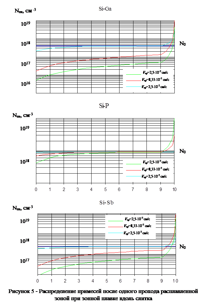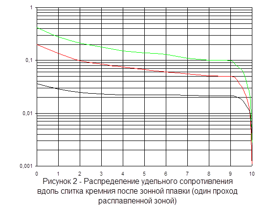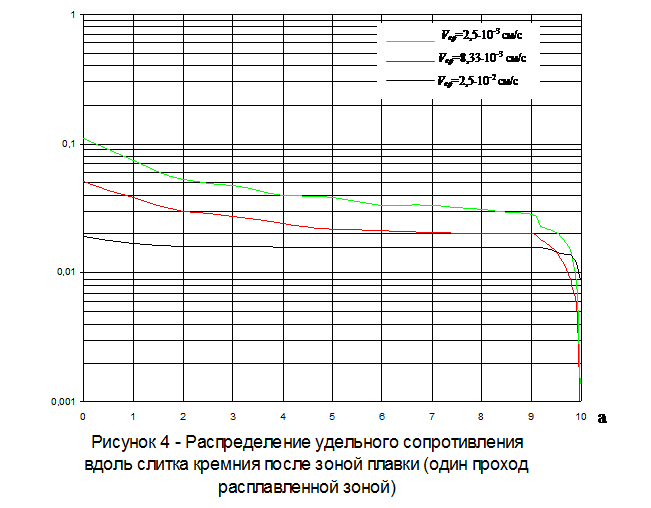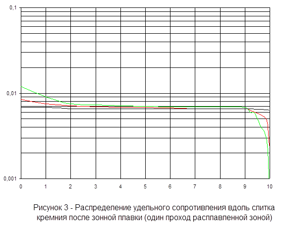 Для процесса зонной плавки произведен расчет для трех очищаемых примесей: фосфор, галлий, сурьма. Результаты расчета представлены в виде таблиц и графиков: распределение удельного сопротивления и распределения каждой примеси вдоль слитка кремния после очистки зонной плавкой (один проход расплавленной зоной).