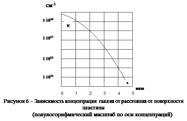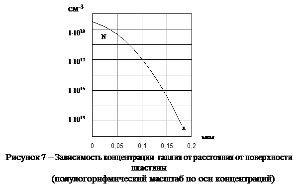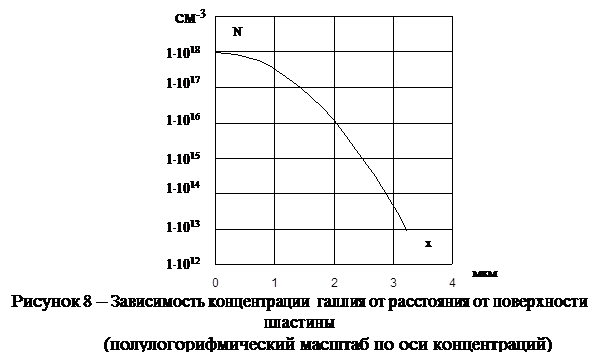 1.4.1 Диффузия из бесконечного источника примеси на поверхности пластины и при температуре, соответствующей максимальной растворимости примеси в полупроводнике; время диффузии 30 мин.= 1800с.