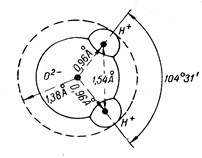 О образуют у центрального атома кислорода очень тупой угол, близкий к 180°. Однако совершенно неожиданно этот угол равен не 180°, а всего лишь 104°31'. Вследствие этого внутримолекулярные силы компенсируются не полностью и их избыток проявляется вне молекулы. На рис. 2 показаны основные размеры молекулы воды.