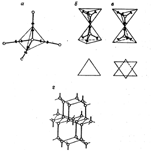а - элементарный водный тетраэдр (светлые кружки - атомы кислорода, черные половинки - возможные положения протонов на водородной связи);