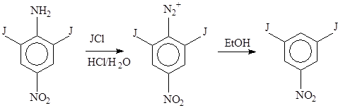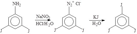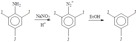 В принципе, существуют различные варианты восстановления аминогруппы до водорода через соль диазония, различающиеся применяемыми восстановителями, условиями проведения реакции и растворителями. В работе [1] 2,4,6-трийоданилин растворялся в смеси бензола и этанола (5 : 1 по объему) при кипячении к раствору добавлялись концентрированная серная кислота и твердый нитрит натрия, при этом образующийся сульфат 2,4,6-трийодфенилдиазония сразу восстанавливается до 1,3,5-трийодбензола (этанол служит восстановителем). После этого большая часть растворителя упаривалась, раствор охлаждался, осадок 1,3,5-трийодбензола отфильтровывался. Далее следовала очистка путем сублимации, потом - перекристаллизации из этанола. Возможна также очистка путем перегонки с водяным паром. Выход больше либо равен 50% от теоретически рассчитанного.