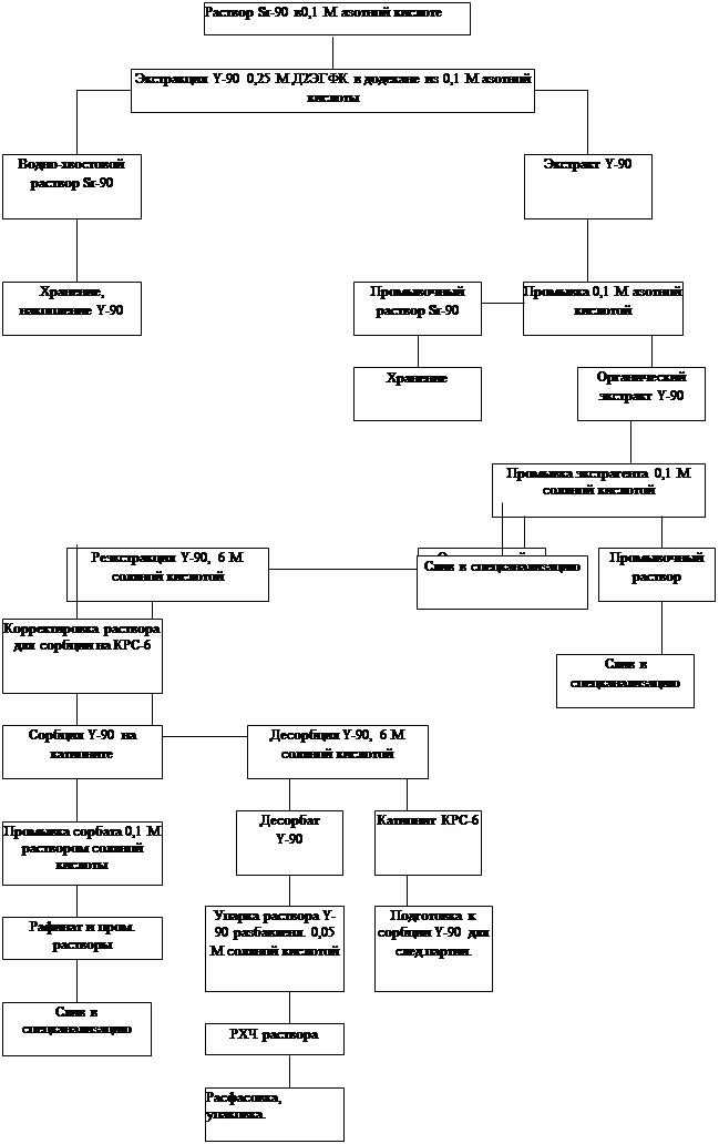 Этот радионуклид получается в процессе распада продукта деления 90 Sr. Основной проблемой безопасного клинического использования 90 Y является его полное отделение от 90 Sr, 90 Sr может вызывать депрессию костного мозга накапливаясь в скелете. Кроме того, как и в других случаях получения радионуклидов для медицинских целей, имеются строгие требования к количеству химических примесей, которые могут подавлять процесс лечения. Невозможно получить конечный продукт с такими строгими требованиями в одну стадию. Поэтому технология отделения 90 Y от 90 Sr включает несколько стадий разделения и очистки. Wire and comp. (1990) кратко описывают применение различных многостадийных систем для производства 90 Y высокого качества для применения в медицине. Каждый из этих методов имеет собственные ограничения. Так использование органических ионообменников ограничивается низкой радиационной стабильностью сорбента. Применение метода соосаждения требует добавления носителя (нерадиоактивногоY). Авторы описывают технологию получения больших количеств 90 Y (около 50 Ки за операцию), используя экстракцию 90 Y из 90 Sr c последующей дополнительной очисткой конечного продукта на ионообменных сорбентах. Экстракция 90 Y осуществляется 1,0 М раствором Д2ЭГФК в додекане из 0,1 М раствора соляной кислоты, содержащего 90 Sr. Затем экстракт трижды промывают равными объемами 0,1 М раствора соляной кислоты для удаления следов 90 Sr. 90 Y реэкстрагируется двумя порциями 6,0 М НСl при соотношении фаз 1:1. После реэкстракции водная фаза испаряется и осадок растворяется в 0,1 М НСl. Затем 90 Y снова экстрагируется 1,0 М раствором Д2ЭГФК в додекане и 4 раза промывается 0,1 М НСl. Две порции по 30мл. 9 М НСl используется для второй реэкстракции. Полученный водный раствор 90 Y пропускается через анионо-обменный сорбент для удаления примесей. Элюат испаряется, растворяется в 0,1 М НСl и пропускается через колонку с катионо-обменным сорбентом для удаления органических примесей и фосфатов. Элюат и промывные растворы (НСl) объеденяются вместе, испаряютися до суха и растворяются для получения конечного продукта в соответствии с требованиями потребителя. Выше описанный метод регулярно исплользуется с1987 г. в Окриджской Национальной Лаборатории. Обычно получают от 5 до15 Ки 90 Y в 10 мл. 0,1 М НСl. Примесь 90 Sr в конечном продукте не превышает 0,015 %, а общее количество примесей тяжелых металлов меньше чем 20 ppm.