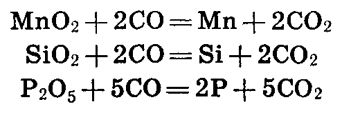 Железо восстанавливается окисью углерода практически полностью. Одновременно частично восстанавливаются кремний и марганец. Восстановленное железо образует сплав с углеродом кокса. кремнием, марганцем, и соединениями, серы и фосфора. Этот сплав—жидкий чугун. Температура плавления чугуна значительно ниже температуры плавления чистого железа.