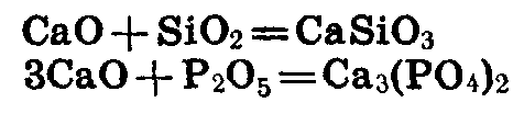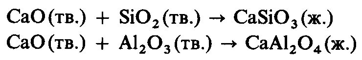 Оксид кальция соединяется с примесями, образуя шлак. Шлак содержит силикат кальция и алюминат кальция: