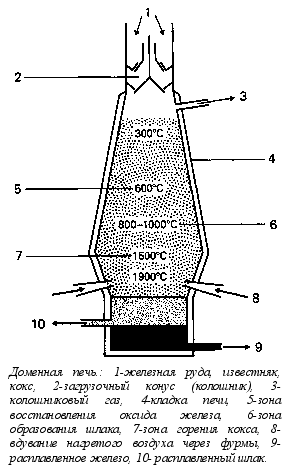 Особенности технологического процесса: чугун получают в специальных печах — домнах. В верхнюю часть домны (колошник) подают последовательно сырье и вспомогательные материалы, в нижнюю (горн) продувают противотоком воздух, предварительно нагретый в регенераторе за счет сжигания колошникового газа. Производство непрерывное (однако засыпание шихты и выпуск чугуна производятся периодически), используются теплота реакции и принцип противотока.