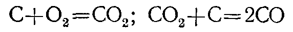 Моноксид углерода СО образуется в доменной печи из кокса и воздуха. Воздух сначала нагревают приблизительно до 600 °С и нагнетают в печь через особую трубу- фурму. Кокс сгорает в горячем сжатом воздухе, образуя диоксид углерода. Эта реакция экзотермична и вызывает повышение температуры выше 1700°С: