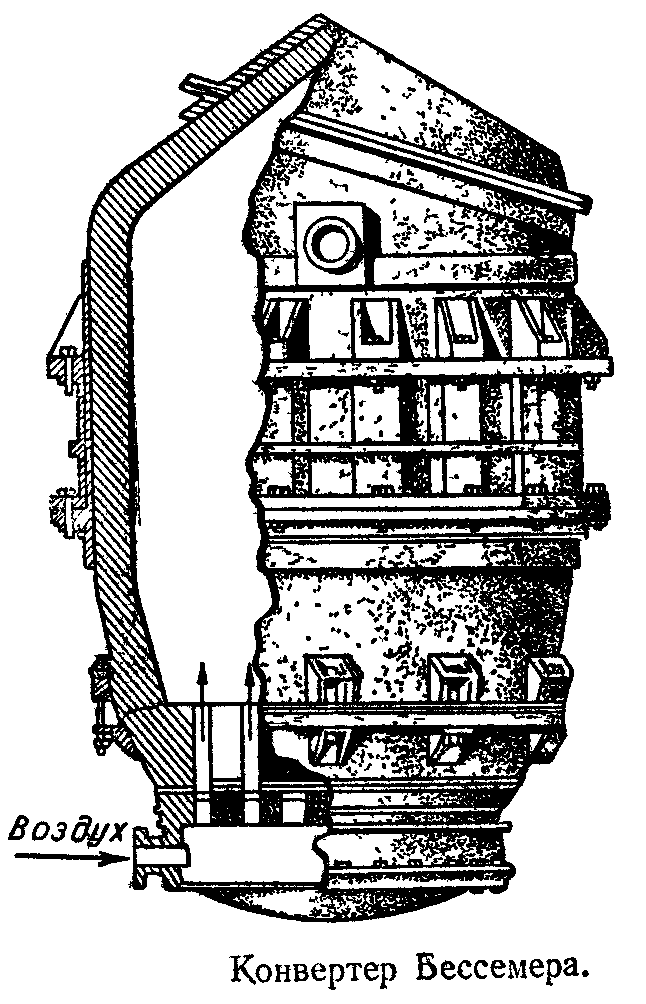 Процесс проводится в аппарате, который называется по фамилии изобретателя конвертером Бессемера. Он представляет собой грушевидный стальной сосуд, футерованный внутри огнеупорным материалом. В дне конвертера имеются отверстия, через которые подаётся в аппарат воздух. Аппарат работает периодически. Повернув аппарат в горизонтальное положение, заливают чугун и подают воздух. Затем поворачивают аппарат в вертикальное положение. В начале процесса окисляются железо, кремний и марганец, затем углерод. Образующаяся окись углерода сгорает над конвертером ослепительно ярким пламенем длиной до 8 л. Пламя постепенно сменяется бурым дымом. Начинается горение железа. Это указывает, что период интенсивного окисления углерода заканчивается. Тогда подачу воздуха прекращают, переводят конвертер в горизонтальное положение и вносят раскислители.