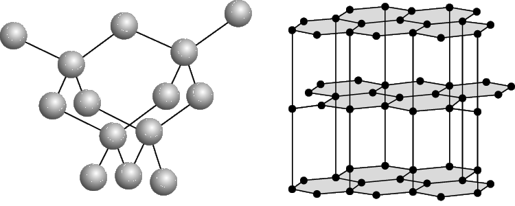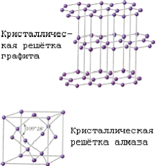 Физические и химические свойства. Известны четыре кристаллические модификации углерода: графит, алмаз, карбин и лонсдейлит. Графит - серо-чёрная, непрозрачная, жирная на ощупь, чешуйчатая, очень мягкая масса с металлическим блеском, обладает электропроводимостью. Атомы расположены параллельными слоями, образуя гексагональную решетку. Внутри слоя атомы связаны сильнее, чем один слой с другим, поэтому графит может расслаиваться. Сгорает при 700єС в рисутствии кислорода. Встречается в природе; получается искусственно. При высокой температуре, давлении и рисутствии катализатора (марганец Mn, хром Cr, платиновые металлы) графит превращается в алмаз. Алмаз - минерал, имеющий желтоватый, белый, серый, зеленоватый, реже голубой и черный цвет. Не проводит электрический ток, плохо проводит тепло. В кристалле атомы углерода образуют непрерывный трехмерный каркас, состоящий из сочлененных тетраэдров, что обеспечивает высокую прочность связей. Алмаз - это самое твердое вещество из всех известных. Температура плавления выше 3500єС. Химически стоек. Сгорает при 870єС в присутствии кислорода. При 1800єС в отсутствие кислорода превращается в графит. Прозрачные кристаллы; после обработки - бриллианты. Добывают из россыпей и коренных месторождений. Синтетический алмаз получают из графита при высоких давлении и температуре. Он чаще полупрозрачный или непрозрачный; имеет кристаллическую структуру и свойства природного алмаза.Жидкий углерод может быть получен при давлениях выше 10,5 Мн/мІ (105 кгс/смІ) и температурах выше 3700єС. Кокс, сажа, древесный уголь (твердый углерод ) имеют то же строение, что и графит.Для твёрдого углерода характерно также состояние с неупорядоченной структурой - так называемый "аморфный" углерод , который не представляет собой самостоятельной модификации; в основе его строения лежит структура мелкокристаллического графита. Нагревание некоторых разновидностей "аморфного" углерода выше 1500-1600єС без доступа воздуха вызывает их превращение в графит. Физические свойства "аморфного" углерода очень сильно зависят от дисперсности частиц и наличия примесей. Плотность, теплоёмкость, теплопроводность и электропроводность "аморфного" углерода всегда выше, чем графита. Карбин получен искусственно. Он представляет собой мелкокристаллический порошок чёрного цвета (плотность = 2 г/смі). Построен из длинных цепочек атомов С, уложенных параллельно друг другу. Лонсдейлит найден в метеоритах и получен искусственно; его структура и свойства окончательно не установлены.