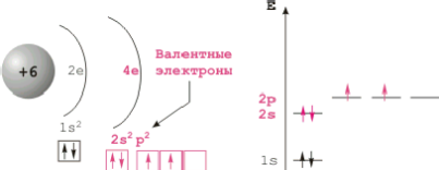 Конфигурация внешней электронной оболочки атома углерода 2s І 2p І . Для углерода характерно образование четырёх ковалентных связей, обусловленное возбуждением внешней электронной оболочки до состояния 2sp і . Химическая связь может осуществляться за счет sp 3 -,sp 2 - и sp - гибридных орбиталей, которым соответствуют координационные числа 4, 3 и 2. Число валентных электронов углерода и число валентных орбиталей одинаково; это одна из причин устойчивости связи между атомами углерода.