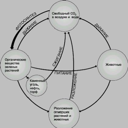 Круговорот углерода. Углерод - основной биогенный элемент; он играет важнейшую роль в образовании живого вещества биосферы. Углекислый газ из атмосферы в процессе фотосинтеза, осуществляемого зелёными растениями, ассимилируется и превращается в разнообразные и многочисленные органические соединения растений. Растительные организмы, особенно низшие микроорганизмы, морской фитопланктон, благодаря исключительной скорости размножения продуцируют в год около 1,5·10№№ т углерода в виде органической массы, что соответствует