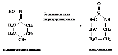 Далее оксим циклогексана в кислой среде (олеум) претерпевает перегруппировку Бекмана, характерную для оксимов многих кетонов. В результате такой перегруппировки происходит разрыв углерод-углеродной связи и расширение цикла; при этом атом азота входит в цикл: