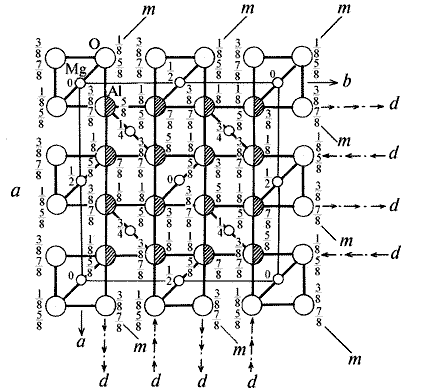 (000) и приведя к нему высоты (координаты z) остальных атомов (Mg и O), увидим, что атомы Al располагаются в такой новой большой ячейке в незанятых атомами Mg октантах. Причем четверки из атомов Al