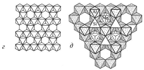 на него атомами Mg, Al и О; г - шпинелевый октаэдрический слой; д - фрагмент структуры в проекции на плоскость (111); способ сочленения шпинелевого и