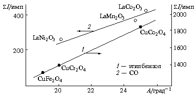 3). Исследована низкотемпературная (20—400 °C) экзоэмиссия отрицательных зарядов со сложных оксидов, имеющих структуру перовскитов состава X3+ Y2+ О3 ( X3+ = La; Y2+ = Co, Mn, Ni) и структуру шпинели X2+ Y2 3+ O4 2- ( X2+ = Cu; Y3+ = Fe, Co, Cr). Найдены корреляции между каталитической активностью в реакциях окисления СО, этилбензола и пропилена и эмиссионной способностью оксидов. Обсуждена роль слабосвязанного кислорода и ионов переменной валентности в процессах экзоэмиссии и окислительного катализа сложными оксидами.