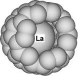 Молекулы фуллеренов, в клетку которых заключены один или несколько атомных частиц (атомов или молекул), получили название эндоэдральных соединений (или эндоэдралов). Для обозначения таких молекул используется формула Мm @Сn где М — инкапсулированный атом или молекула, а нижние индексы m и n указывают на число таких атомов и атомов углерода в молекуле фуллерена соответственно [12]. Рекомендуемое IUPAC название для La@C82 звучит следующим образом “[82] fullerene-incar -lanthanum” и записывается в виде i LaC82 [13].