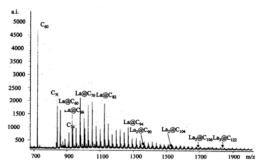 Синтез эндоэдральных фуллеренов в микроколичествах был впервые осуществлен в работе [14], существенной особенностью, которой было использование в качестве лазерной мишени композитного материала, полученного прессованием La2 O3 , графитового порошка и смолы. Мишень помещалась в цилиндрическую, заполненную гелием, подогреваемую камеру. Как показали результаты масс-спектрометрического анализа, при лазерном облучении металлографитового материала в атмосфере гелия наряду с полыми фуллеренами образуются также эндоэдральные соединения типа La@C2 n , где n³30.