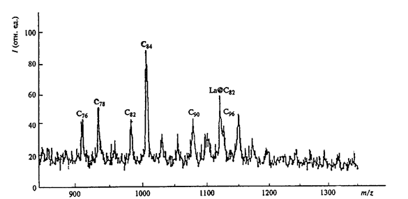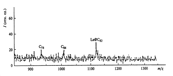 Расширение круга растворителей, используемых для экстракции эндоэдральных соединений из фуллеренсодержащей сажи, приводит к увеличению списка синтезируемых соединений. Так, применение для этой цели анилина [26] позволило выделить целую группу эндоэдральных соединений, куда вошли Y@C60 , Ba@C60 , La@C60 , Ce@C60 , Pr@C60 , Nd@C60 и Gd@C60 при относительно низких температурах. При этом даже не понадобилось обеспечение анаэробных условий. Растворитель (анилин) прокачивался через сажу в течение 3 - 5 часов при температуре 273-278 К. Полученный экстракт исследовался в масс-спектрометре с лазерной десорбцией. Масс-спектр экстракта, полученного из сажи с помощью анилина, содержал пики указанных выше эндоэдральных соединений (рис. 8), причем интенсивность пиков, как правило, была соизмерима с интенсивностью пиков полых фуллеренов С60 и С70 .