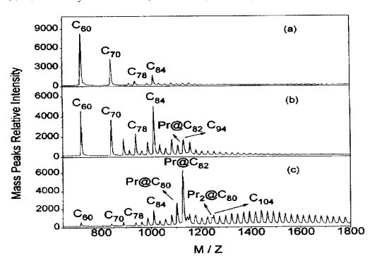 В работе [19] было предложено для увеличения выхода эндометаллофуллеренов проводить экстракцию под давлением и при высокой температуре, используя в качестве растворителей: толуол или пиридин. Масс-спектрометрический анализ толуольного экстракта (рис. 6a) полученного с использованием аппарата Сокслета показал, что экстракт содержит в основном полые фуллерены, в то время как эндофуллерены присутствуют на уровне фона. Проводя экстракцию толуолом под высоким давлением и при температуре 200 0 С, эффективность экстракции возрастает, но содержание эндофуллеренов в экстракте по данным масс-спектрометрии меньше, чем фуллеренов (рис. 6в). Заменив толуол (дипольный момент которого равен 0,36 D) на пиридином (с дипольным моментом 2,19 D) удалось получить экстракт с выходом 0,6 % от веса сажи. Экстракция проводилась под давлением и при температуре 200 0 С. В масс-спектре пиридинового экстракта основным молекулярным ионом является Pr@C82 (рис. 6с).