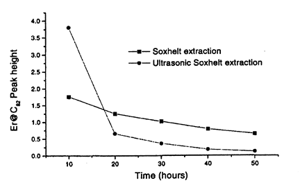 Количество Er@C82 выделяемого за 10 часов в УЗСЭ много больше чем в СЭ. За 30 часов экстракции в УЗСЭ выделяется до 90 % металлофуллеренов, а в СЭ только 50 %. Схематически процесс экстракции с применением ультразвука можно представить, как разрушение сажевых агрегатов и сольватация ДМФА фуллеренов и эндофуллеренов. Результатом применения ультразвука является ускорение процесса экстракции, но получаемые экстракты по данным ВЭЖХ остаются низко обогащенными Er@C82 .