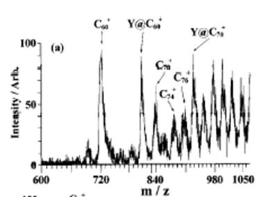 Интересная особенность эндоэдральных соединений связана еще с тем, что атом, заключенный в фуллереновую оболочку, практически теряет свои индивидуальные химические свойства. На это указывают, в частности, результаты одного из первых экспериментов [39] по установлению химических характеристик эндоэдральных фуллеренов. В этой работе сравниваются химические активности по отношению к реакции с молекулой N02 эндоэдральной молекулы Y@С60 полученной методом лазерного испарения, и экзоэдральной молекулы Y@С60 , полученной в масс-спектрометре ионно-циклотронного резонанса с фурьепреобразованием. Как показывают измерения, атом иттрия, входящий в состав экзоэдрального соединения легко окисляется с образованием YO, в то время как эндоэдральный комплекс сохраняет стабильность даже при повышении концентрации N02 в 1000 раз. Этот результат, который дополнительно подтверждает эндоэдральную структуру молекулы.
