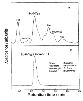 На рисунке 9 показаны типичные хроматограммы, которые наблюдаются при последовательном выделении эндоэдрального соединения Sc@С82 (I) [32]. На первой стадии ВЭЖХ раствор экстракта эндометаллофуллеренов в толуоле разделяют, используя колонку Trident-Tri-DNP (Buckyclutcher I, 21 mm ´ 500 mm: Regis Chemical) или колонку 5-PBB(pentabromobenzyl) (20 mm ´ 250 mm, Nacalai Tesque) в качестве элюента используется CS2 . На этой стадии отделяют фракцию, содержащую Sc@C2 n от фракции С60 , С70 и высших фуллеренов (С76 -С110 ). Разделение и очистка скандий содержащих эндофуллеренов осуществляется на второй стадии ВЭЖХ с использованием колонки Cosmosil Buckyprep (20 mm ´ 250 mm, Nacalai Tesque), элюент толуол. Как видно, последовательное использование на различных стадиях очистки колонок, отличающихся сортом сорбента, позволяет освободить раствор от фракций, для которых время задержки близко к соответствующему значению для целевого продукта. В таблице 1 приведены эндометаллофуллерены выделенные методом ВЭЖХ [33].