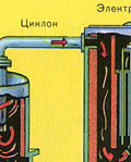 Из печи выходит печной газ, состав которого: SO2 , O2 , пары воды (пирит был влажный!) и мельчайшие частицы огарка (оксида железа). Такой печной газ необходимо очистить от примесей твёрдых частиц огарка и паров воды.