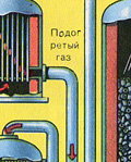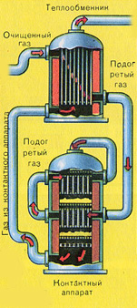 Прежде чем смесь SO2 и O2 попадёт в контактный аппарат, её необходимо нагреть до температуры 400-500°С. Нагрев смеси начинается в теплообменнике, который установлен перед контактным аппаратом. Смесь проходит между трубками теплообменника и нагревается от этих трубок. Внутри трубок проходит горячий SO3 из контактного аппарата. Попадая в контактный аппарат смесь SO2 и О2 продолжает нагреваться до нужной температуры, проходя между трубками в контактном аппарате.