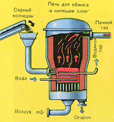 Измельчённый очищенный влажный (после флотации) пирит сверху засыпают в печь для обжига в "кипящем слое". Снизу (принцип противотока) пропускают воздух, обогащённый кислородом, для более полного обжига пирита. Температура в печи для обжига достигает 800°С. Пирит раскаляется до красна и находится в "подвешенном состоянии" из-за продуваемого снизу воздуха. Похоже это всё на кипящую жидкость раскалённо-красного цвета.