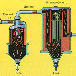 Очистка печного газа от твёрдых частичек огарка проводят в два этапа - в циклоне (используется центробежная сила, твёрдые частички огарка ударяются о стенки циклона и ссыпаются вниз) и в электрофильтрах (используется электростатическое притяжение, частицы огарка прилипают к наэлектризованным пластинам электрофильтра, при достаточном накоплении под собственной тяжестью они ссыпаются вниз), для удаления паров воды в печном газе (осушка печного газа) используют серную концентрированную кислоту, которая является очень хорошим осушителем, поскольку поглощает воду.
