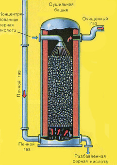 Осушку печного газа проводят в сушильной башне - снизу вверх поднимается печной газ, а сверху вниз льётся концентрированная серная кислота. На выходе из сушильной башни печной газ уже не содержит ни частичек огарка, ни паров воды. Печной газ теперь представляет собой смесь оксида серы SO2 и кислорода О2 .