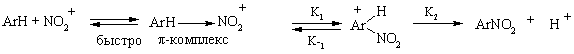 Это уравнение даёт лишь общее представление о ходе реакции, но не характеризует всего сложного процесса нитрования, протекающего в несколько стадий; в действительности в реакцию с ароматическими углеводородами вступает не сама азотная кислота, а продукты её превращения.