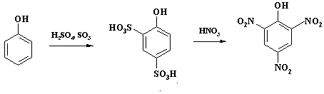 Образующийся по реакции (3) фенол нитруется со значительно большей скорость, а потому в условиях нитрования бензола фенол даёт моно-, ди- и даже тринитрофенол. Поэтому нитрующая смесь, которую применяют для нитрования бензола, не должна содержать оксидов азота.