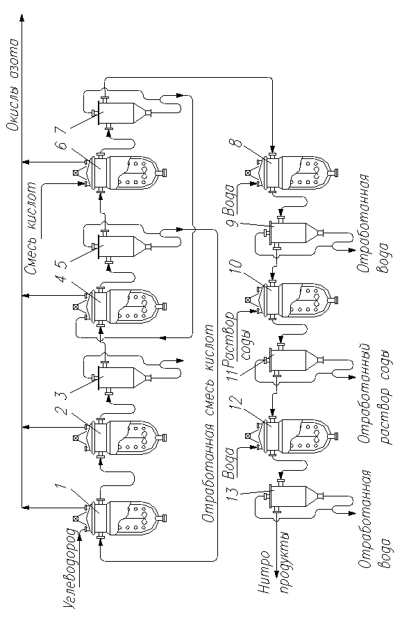 1,2,4,6 – нитраторы; 3,5,7,9,11,13 – сепараторы; 8,10,12 – промывные ёмкости