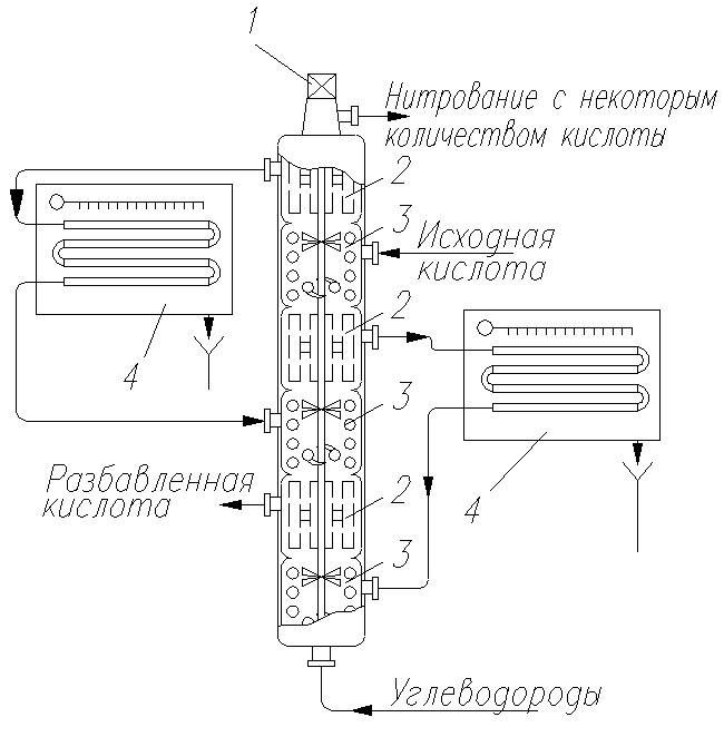 В емкостном реакторе с рубашкой и змеевиком, который выполняет функцию диффузора, подача нитрующей смеси и бензола осуществляется в верхнюю часть внутреннего пространства диффузора, где также работает многоярусная пропеллерная мешалка, направляющая реакционную массу к днищу и далее к стенке аппарата. Вывод реакционной массы осуществляется через верхний штуцер. Подача нитрующей смеси и бензола осуществляется с помощью мерников непрерывного действия. Реакционную массу, вытекающую из нитратора, насосом передают в кожухотрубные холодильники, в которых она охлаждается до 20-250 С. При этом происходит окончание реакции. Из холодильников смесь поступает в сепаратор непрерывного действия, где разделяются нитробензол и отработанная кислота, которые поступают в соответствующие сборники. Сепараторы для разделения эмульсий могут иметь различную конструкцию – вертикальные или горизонтальные отстойники, центрифуги, гидроциклоны и т.д.