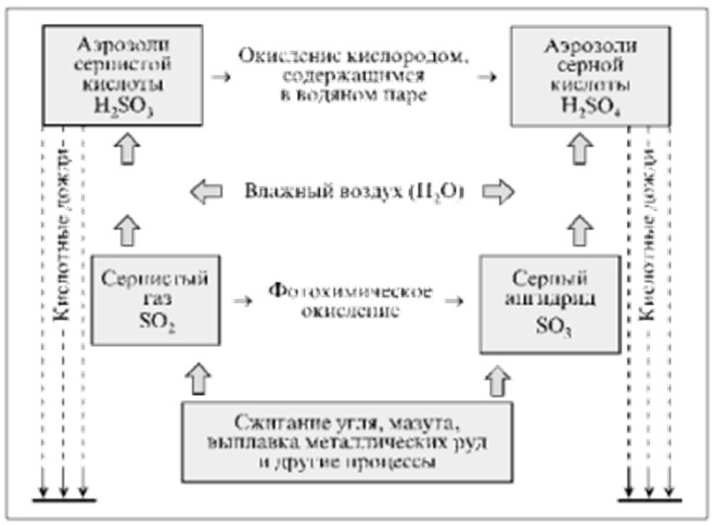 Диоксид серы, попавший в атмосферу, претерпевает ряд химических превращений, ведущих к образованию кислот.